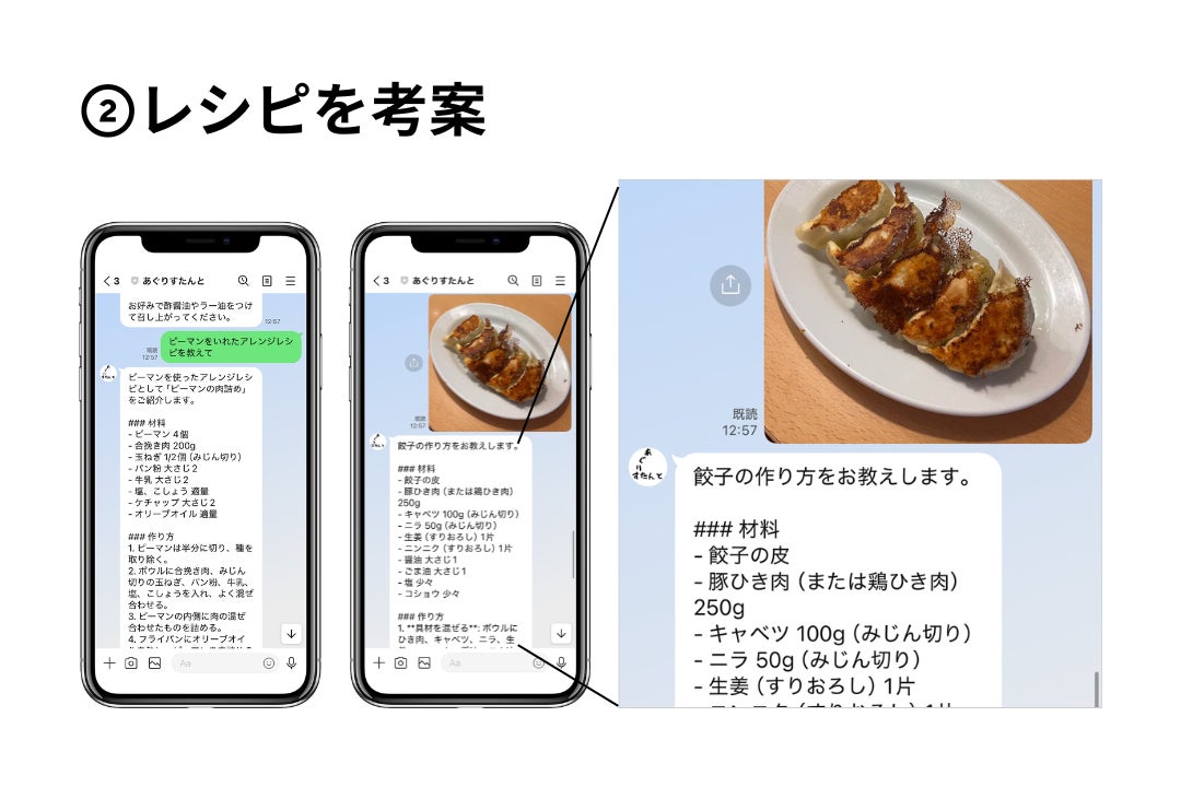 料理の写真を送信すると、AIが料理の内容を判別し、レシピやアレンジ提案を行います。